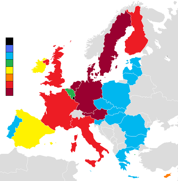 The countires are colour coded according to their ratio of financial contributions and returns relating to the EU budget. At the dark red end of the scale countries like Sweden and Germany get back far less from the EU budget than they pay in (notice that the UK is in the red), while at the light blue end are countries which get back far more than they contribute.