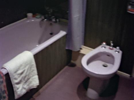Next we cut to Jack ordering food over a phone in his room and the documentary wastes no time in making parallels with the movie content. Jack tells Vivian she looks cute in her red shirt – Danny also wore one at several points in the film. Vivian then films Jack’s bathroom – mirror on the right, bath tub to the left, just like the bathroom in the Torrance apartment.