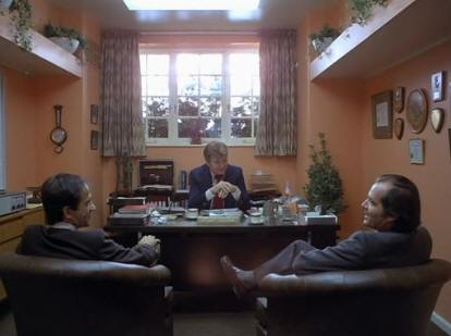 In Ullman’s office Jack makes a verbal reference to the allure of false enlightenment. Ullman, “When the place was built in 1907 there was very little interest in winter sports, and this site was chosen for it’s seclusion and scenic beauty.” We immediately cut to a wide shot of the window behind Ullman’s desk as Jack responds, “Well it’s certainly got plenty of that.” The resulting laughter from the three characters further supports the in-joke about the false light from the window.