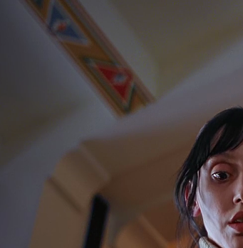 These days the pyramid and eye is widely rumoured to be a Freemasonic secret society symbol, although Freemasonic Eyes of Providence tend not to feature pyramids below them. The symbol has also been rumoured to belong to an alleged secret society group called the Illuminati. Now before we move on, I first need to make some statements on the subject of conspiracy theories because this is an area of polarized public opinion. Some people lose interest in a discussion as soon as they encounter any information related to conspiratorial interpretations of modern society, while others lose interest in anything that doesn’t interpret our society as conspiratorial to the core. Personally, I’ve found both extremes of the conspiracy theory debate to be equally at fault. Some of the more hardcore conspiracy enthusiasts actually believe the Earth is controlled by a race of shape-shifting lizards living in underground bases. There are even detailed documentary films and books available on the subject that cite a great deal of historical evidence as “proof” of the lizard race theory. I’ve worked with enough schizophrenics over the years who thought they were either Jesus, the Devil or Paul McCartney to be aware of how people can construct a complex non-reality for themselves, so I can assure you here that I’m not going to try and persuade you of any baseless conspiracy theories with this film analysis. On the other hand I must also assert that the evidence of grand scale corruption in our own western back yards during recent years is overwhelming. We were lied to on a massive scale by political leaders and a largely compliant mainstream media that a war with Iraq was completely necessary [1] [2] [3] [4] [5]. The evidence of a WMD threat from Iraq was manufactured as a false justification for an imperialistic oil war, yet some people still adamantly refuse to acknowledge this and prefer to be believe that we’re fighting a shadowy network of underground extremists who operate globally to cause mass destruction on whatever level they can – which itself is a conspiracy theory. Any serious attempt to decode Kubrick’s films must allow for the possibility that Kubrick himself may have interpreted our society conspiratorially. The subliminal symbols of 2001: A Space Odyssey, A Clockwork Orange and Eyes Wide Shut strongly suggest that this was the case. So I must ask you to join me in the conspiratorial middle ground as we explore The Shining in more detail. I only half suspected that the false enlightenment themes of The Shining were related to the Eye of Providence until an email correspondent pointed out an important set detail in the Colorado Lounge. It’s seen only once in the film. As Wendy leans forward to flick through Jack’s manuscript there is a slightly out of focus strip of colourful designs on the ceiling that do not look like Native American designs. The strip contains alternating blue and red triangles, each with a circular object in the centre. They look very much like the eyeball and triangle design featured on the Clockwork Orange poster. Is this the Eye of Providence?