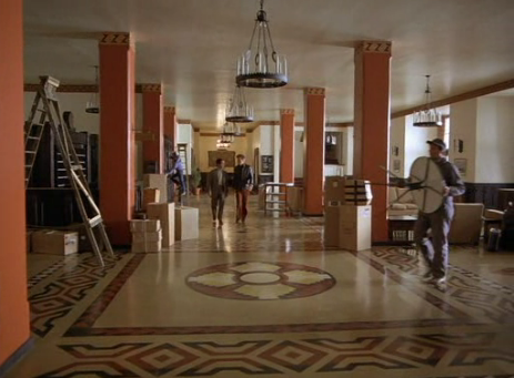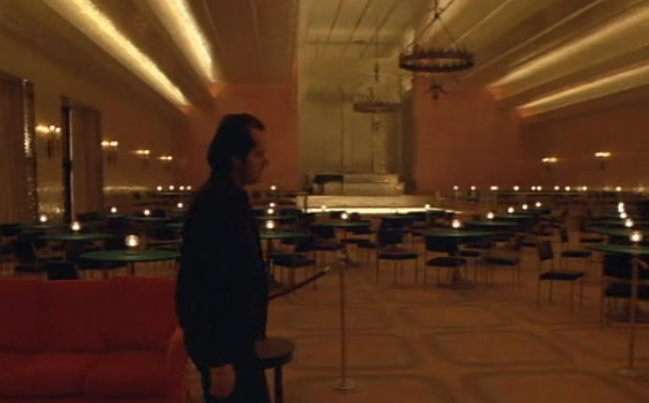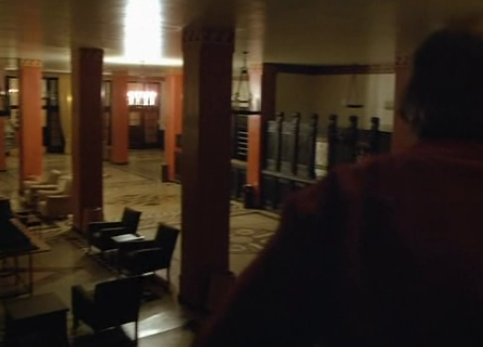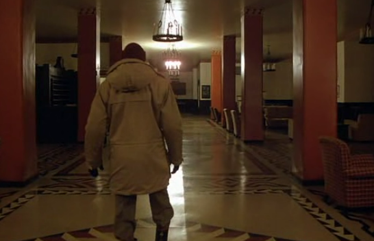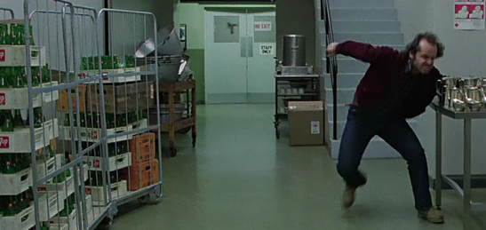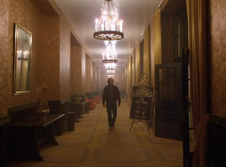 Of course this could just be an accident, so rather than just believe my interpretation I invite you to examine the use of chandeliers throughout the entire scene. Halloran’s shouting of “Hello, is anybody here?” is first heard as Jack limps through a side entrance to the lobby. From over his shoulder we can see again that there is only one chandelier switched on, but it’s not the one near Ullman’s office. It’s the one by the reception.
