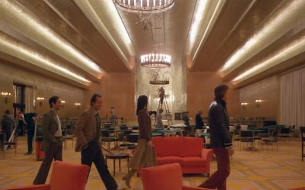 Can you see it yet? The curved arc of the ceiling against the rear wall, and the straight alcoves of light running the length of the ceiling, create a giant image of the blazing Sun or Eye of Providence. There are three scenes in the Gold Room and each one shows a long tracking camera movement in which we see this blazing globe.