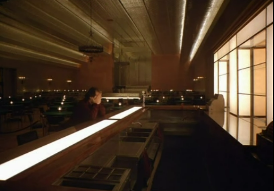In the Shining we get another of these flat perspective pyramids with false enlightenment at the apex. This one occurs in the slow lead up to Halloran’s death. Halloran walks through the hotel Lobby with the camera following behind him. There is a single onscreen light source – a chandelier outside Ullman’s office. Combined with the angle of the floor patterns, and if viewed in flat perspective, we see a pyramid with the illuminated chandelier at the apex. Notice also how Kubrick has carefully framed the shot so that the chandelier remains visible over Halloran's shoulder instead of the shot composition being perfectly symmetrical.