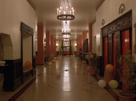 His banter with Grady that he has “plenty of jackets” plus the casual way in which he is greeted as one of the club, is an outright announcement that in this scene Jack is really dressed in a tuxedo and that the presence of his cheap clothes is simply a visual lie to keep the audience locked into the surface narrative. There is also a cross symbolism between the ballroom party and the slaughter of the natives. Jack first hears the music of the party while wandering about in the halls, at which point he sees balloons and party confetti scattered about the lobby.