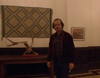 In our first close up view of this tapestry Jack stands dead centre screen with his head placed over the exact centre of the tapestry. The shot composition is also mirrored, just as the diamonds of 2001 were pyramid capstones mirrored at the base.