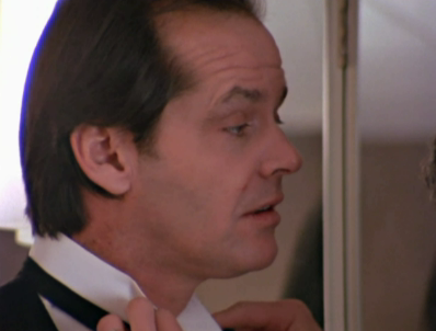 Is this a blatant continuity error or a hint that the switching of lights was deliberate? Also think about the timing of the flat perspective pyramid and illuminated apex motif. It occurs in the immediate build up to Halloran’s death. The message here seems to be that whoever placed the Eye of Providence on the Dollar bill was also responsible for the genocide of the Native Americans, represented by Halloran. In chapter nine we explored how the ghostly figures of Grady and Lloyd the bartender were basically reflections of Jack talking to himself. We also identified that the party guest with the wine glass was simply another manifestation of Jack. The Englishness of these alter egos is important because it establishes Jack as a symbolic member of the Gold Room party crowd. A very brief shot of Jack in the making of documentary even shows him in a tuxedo.