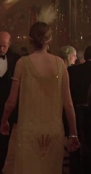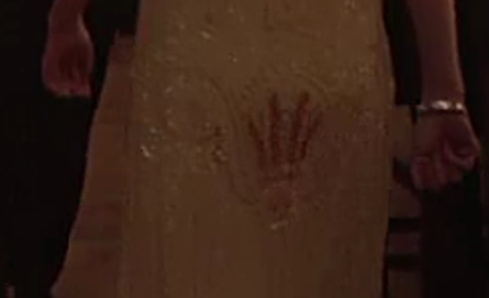 More clues can be found in the Gold Room. Notice that there are no sunrays running along the centre of the ceiling. This undoubtedly has made it more difficult for audiences to notice the sun symbolism of the room, but as Jack dances about during the party scene we get to see another piece of the message. A woman in a white gown strolls past Jack and on her backside is an unusual red marking. In the standard DVD release it looks like a hand print, which I couldn’t make sense of, but in the HiDef version the marking is much clearer. It shows a small red sphere with four rays coming from it at the same angles as the missing sun beams in the ceiling design.