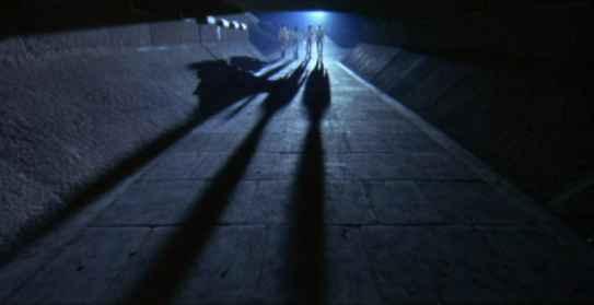 A less complex example was used in the tramp beating scene of A Clockwork Orange. Alex and his gang approached the tramp from a bright shining light source depicted at the apex of a pathway, which if viewed in flat perspective formed a pyramid.