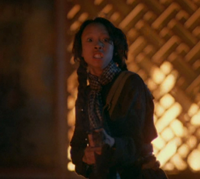 As she fires her Kalashnikov machine gun, a large golden sphere symbol is featured on the wall behind Joker (the soldier she is firing at) and in its centre is a Swastika sun symbol as used by native tribes (not the tilted Nazi version).