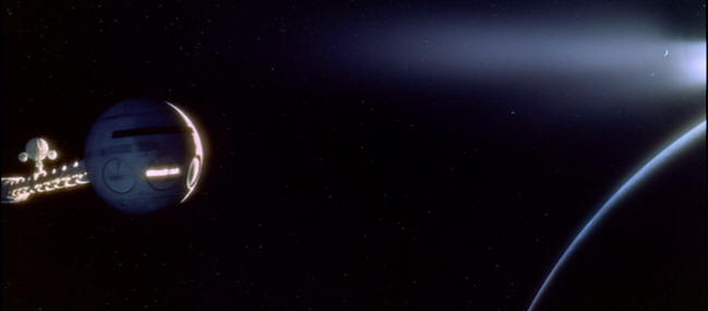 The flat perspective method was also used in the council meeting scene of 2001 to encode a pyramid and eye image. Our view of Floyd giving his speech showed the table in a pyramid formation with Floyd at the apex and a white cinema screen behind him. During the stargate the light patterns began to fill up the screen with pure white, as if draining away the colours of the film to reveal an empty cinema screen, before cutting to a close up of a human eye followed by a dazzling explosion. If the eye or explosion is mentally projected over the blank white screen in the council meeting then the pyramid and Eye of Providence symbol is completed (see chapter 11 of the 2001 analysis for more details).