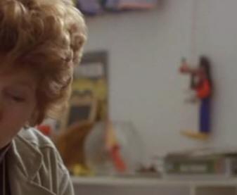 Now I’ll offer some interpretations of possible additional cartoon references in the film and how, in combination with the more obvious examples, they thematically affect the story. One of the most prominent conceptual uses of these cartoon symbols is that when the psychiatrist is questioning Danny on his bed, Wendy is wearing clothes that are virtually identical to those of the Goofy figure beneath the window – yellow boots, a red sweater and blue overalls (a blue dress for Wendy).